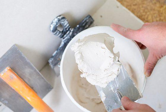 На этом этапе потребуются два шпателя, широкий для нанесения шпатлёвки на поверхность стены и небольшой шпатель для захватывания шпаклёвки из ёмкости, непосредственно стартовая шпаклёвочная смесь и ёмкость, в которой её замешивают.