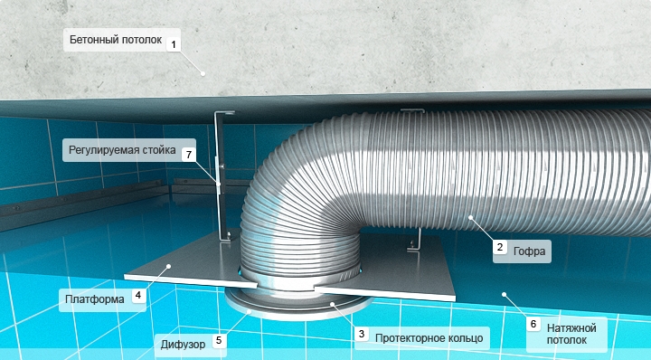 Сначала необходимо провести монтаж воздуховодов, которые следует прочно закрепить на несущих конструкциях. Только после этого можно заняться установкой пленочной системы, определить расположение отверстий и установить необходимые термо-пластиковые элементы.